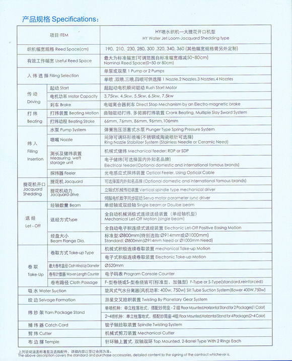 HY 系列噴水織機 HY系列噴水織機能夠以最少的運轉成本,高品質、穩定的織造技術為面料生產商提供安全的生產效能保證。從普通輕薄面料到高端厚重的高附加值織物, HY系列噴水織機是真正實 現用戶至上的噴水織機。 |