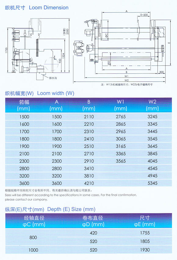幅寬:150cm~360cm。單噴﹑雙噴或三噴緯入裝置,雙層經軸,雙伺服電機,電子送經,機械或電子卷取,配置了電子多臂或凸輪開口裝置,能夠保證雙層織物的幾種不同經紗張力的平衡,解決了中等厚重織物和高密度織物的織造穩定性及雙層組織織物布面平整度的問題。織物的適應范圍在不斷的擴大,符合不斷創新的市場需求,是客戶在競爭中取勝的可靠保證。(專利申請號:200920075818)
