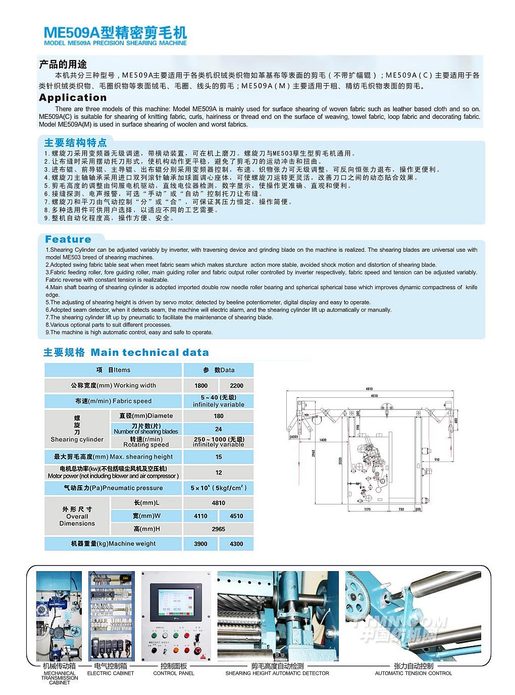 本機共分三種型號,ME509A主要適用于各類機織絨類織物如革基布等表面的剪毛(不帶擴幅輥);ME509A(C)主要適用于各類針織絨類織物、毛圈織物等表面絨毛、毛圈、線頭的剪毛;ME509A(M)主要適用于粗、精紡毛織物表面的剪毛。是在吸收消化先進進口機的基礎上,自主創(chuàng)新的新型設備,具有同類進口機的優(yōu)良性能。