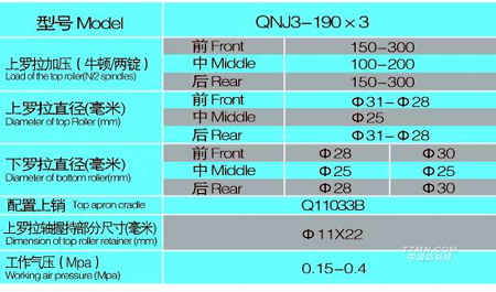 QNJ3-190×3氣動加壓粗紗搖架,采用三羅拉雙短皮圈牽伸系統,適紡60毫米以下長度的棉、化纖或者合成纖維。