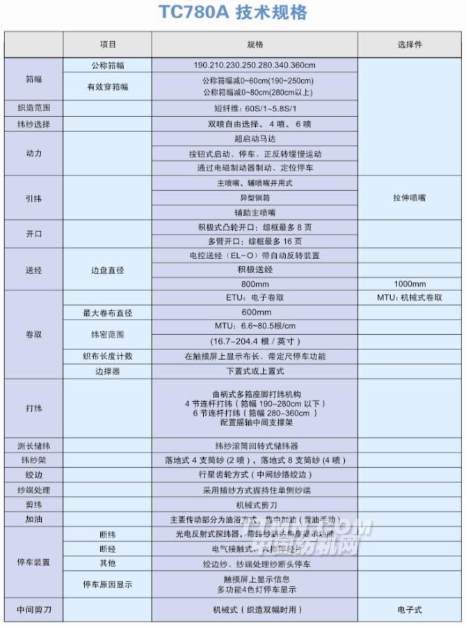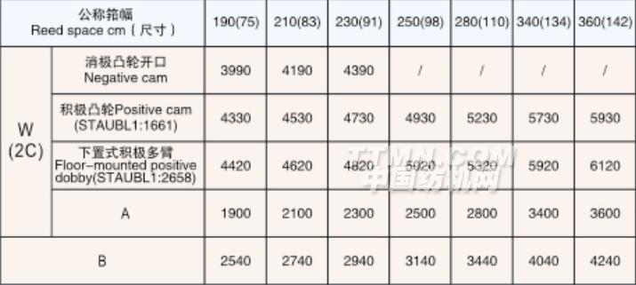 性能指標:公稱筘幅為190-360cm(可根據用戶需求生產相應的筘幅),上、下織軸盤片直徑φ800mm(或914mm)、主軸轉速400-750rpm(實際車速根據織物規格確定)、筘幅可調范圍0-800mm、適用織造長絲或短纖、卷布直徑550mm、上下織軸經紗雙伺服控制、電子多臂開口(16片)、電子卷?。C械卷?。?0.4"觸摸液晶顯示智能電腦控制。