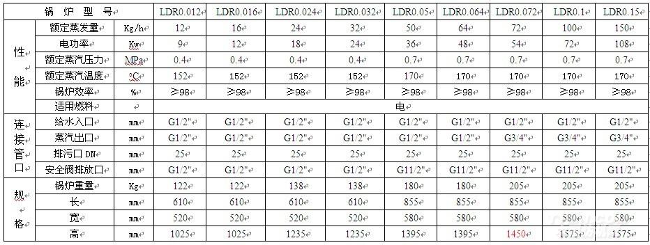 LDR電蒸汽鍋爐主要技術參數(shù)