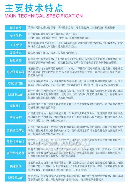 YQFJ467/468型懸錠紗機是總結FA系列粗紗機優點的基礎上,充分運用了計算機控制、變頻調速、CCD張力微調及計算機大容量數據存儲技術開發的高速懸錠粗機,對機器結構進行簡化,取消了傳統的機械式鐵炮機構,差速箱機構,換向箱機構等裝置,采用變頻系統替代傳統的傳動機構,取消了除牽伸以外的工藝配換齒輪,是目前國類最先進的機電一體化四電機高速懸錠粗紗機之一。通過閉環系統控制電機,分別實現錠翼、羅拉、卷繞、龍筋升降四大運動的調速同步匹配,有效解決了傳統懸錠 紗機張力變化大以及鐵炮成形不精準等缺陷,實現了防塌肩、防細節、定長定位絡紗、斷電保護及網絡接口等功能,適用于普通和精梳棉型纖維的純紡和混紡,能滿足紗紡制的最佳要求。