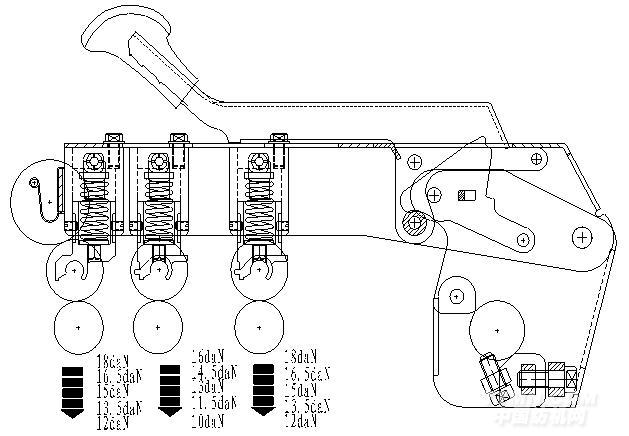 直壓式彈簧加壓搖架把傳統(tǒng)的彈簧加壓搖架的四連桿-加壓桿加壓改為三檔皮輥直壓式彈簧加壓,彈簧壓力直接作用于皮輥上,取消了加壓桿和連桿結(jié)構(gòu),三檔皮輥壓力可獨(dú)立直接調(diào)壓