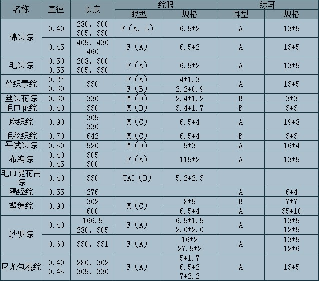 豐衣牌鋼絲綜規格、種類齊全,并可根據用戶要求制作各種特殊規格。