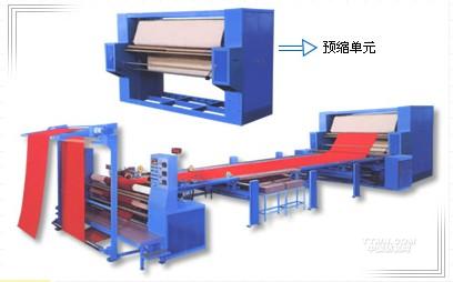 3、呢毯預縮定型機由L下兩組呢毯預縮單元組成。耐高溫的NOMEX無縫呢毯厚度20mm。預縮阻尼板可任意調節預縮量,預縮定型機的工作溫度可達200℃,并配有可調節風量的冷卻系統,上下呢毯預縮單元之間裝有高靈敏度的織物張力調節桿,可根據不同的織物,自動精確調節同步車速,以確保預縮質量。