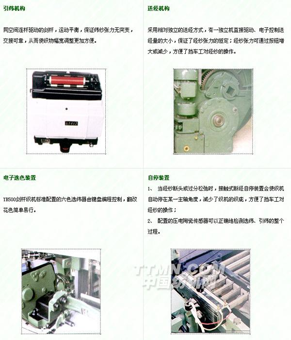 YR500劍桿織機是采用了電腦輔助設計、數控機床精密加工的新一代織機,該機型結構緊湊、功能齊全、操作簡便??棛C重量分布均勻,高速運轉部位受力均衡,大大降低了織機運轉過程中的震動,是織造行業的首選產品。 織機的傳動由主電機通過單根V帶傳動電磁離合制動器,驅動筘座及劍桿的運動。同時,由微處理器檢測織機的運轉情況,控制電磁離合器的吸合與制動。 人機工程學??棛C運用了人機工程學設計原理,便利了擋車工的操作,織機的所有功能皆由按鈕控制,液晶數字顯示器顯示,信號燈顯示斷緯 、斷經等停車故障,所有這些都方便了織機的操作與維護;加上連續不斷的氣流清除附在劍桿上飛花、雜質、保證了織物的品質。 |