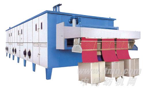 高效率,低能耗的預縮烘干機,將織物喂進網狀運輸帶。喂布時有點超喂量。運輸帶將織物送入烘干箱。上、下兩層錯開的噴嘴將熱風噴出。當執風噴到織物表面時,織物形成波浪。熱風將織物內水分蒸發,少部分的蒸汽被排出機外。溫度控制器檢測排氣的溫度以保證系統有效使用能源,蒸汽或熱油可以是間接熱源,而天然氣或煤氣可以是烘干時的直接熱源。非接觸式溫度檢測儀監控織物表冇溫度以保證織物不會過度加熱及有效使用能源。烘干后的織物通常搖折在載布車內。
