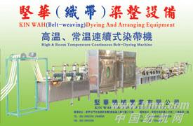 3.本機臺為高效率織帶染色機,由放帶裝置→染缸→高溫、低溫烘干定色箱→固色箱→洗水槽→預干筒→上漿槽→燙干定型→收帶