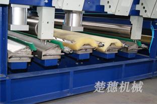 2.2 水洗:印花導帶在完成一次印花后,先洗去粘附在表面的紗頭、余膠和印染等污物,方能進行下一次貼布印花,導帶水洗由預洗和主洗兩部分組成。設有可移動清洗裝置,以粗孔泡沫海綿揩擦導帶表面,并以聚氨脂平面刮刀清除表面的污物及水分。聚氨酯刮刀間隔排列組成,對導帶進行反復沖、刮、擦、洗并刮干水分。