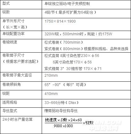 該機主要以錦綸、滌淪等化纖長絲;棉、麻等天然纖維為適用原料,經超喂后,卷裝成可供染色的松式筒子紗;并配備有定長、定徑等功能,其中定長精度達到≤5‰,能夠滿足統一包裝及整批整經需要。此外,可另行選配上油等附屬裝置,適應多種倒筒需要。是一款現代紡織、印染、針織等行業不可多得的產品。
