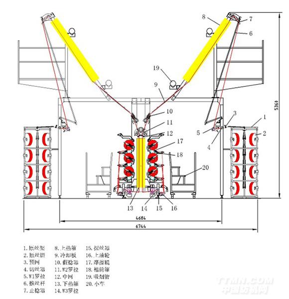 該機主要是將POY原絲(聚酯預取向絲),通過拉伸和假捻變形加工成具有低彈、高彈性能的假捻變形絲(DTY彈力絲),若在設備上選擇增加網絡部件還可以進行網絡絲的加工。