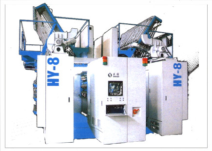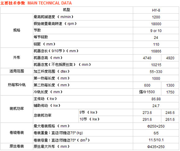 HY-8型高速彈力絲機是宏源公司根據國際上假捻變形技術的發展趨勢自主開發的新型全自動落筒型機。該產品的自動化、機電一體化程度很高,適應現代化企業的需要。最高機械速度達1200m/min。