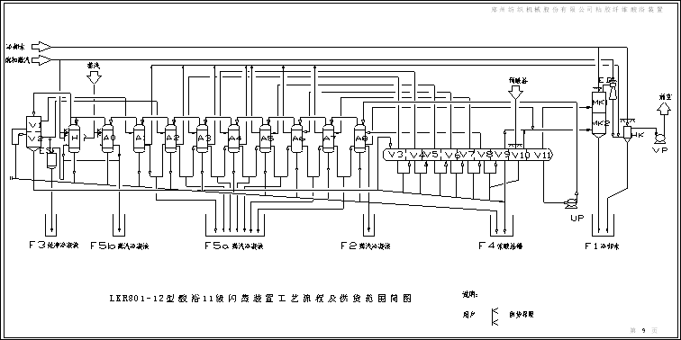 本裝置用于粘膠紡絲浴的蒸濃。把粘膠帶進酸浴中的水分蒸發出來,保持酸浴組成的平衡,回收從紡絲機出來的酸浴。