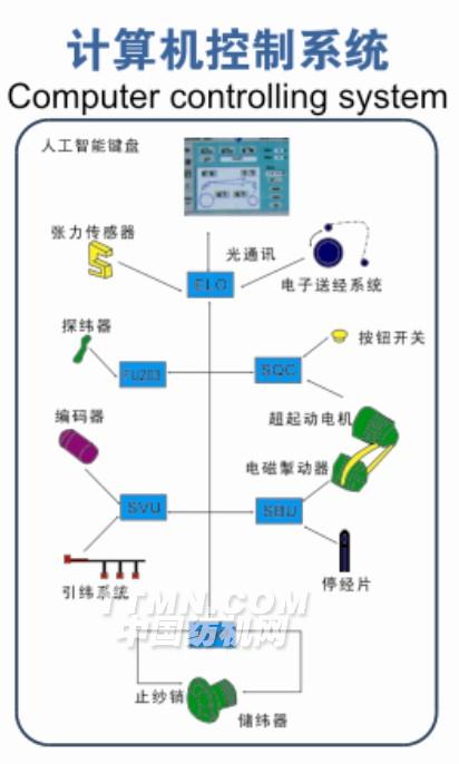 配有人機界面鍵盤,可以將織機運轉狀態、故障原因、織造工藝參數及織機設定條件等信息顯示在顯示屏中。通過功能鍵方便的輸入各種數據,還可通過記憶卡將各種設定參數長期保存或隨時輸入到其織機中。