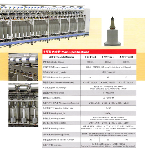 適合各類長、短纖維絲、紗的捻,具有高速、卷裝大、浪費小、用人省等顯著特點(已在帆布類、箱包行業廣泛使用,在牛津布1680大有光絲的加捻已大面積采用)。采用整體式傳動,機電一體化程度高,特殊的動程控制,確保高速卷繞下優質成型與運行的穩定性,高品質的錠子結構設計,確保絲、線品質的穩定性。優質的紗線通道與加捻過程摩擦隔離控制,將纖維損傷降到最低,更適合高品質產品的要求。