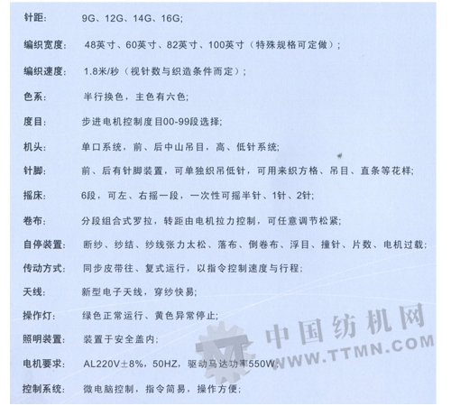 該系列設備采用單口系統,前、后中山吊目,高、低針系統,前、后有針腳裝置,可單獨織吊低針,可用來織方格、吊目、直條等花樣分段組合式羅拉,轉距由電機拉力控制,可任意調節松緊。適用于腈綸、混紡、紗線等原料編織成衣領、袖口、服裝下擺、鞋套等服裝附件.