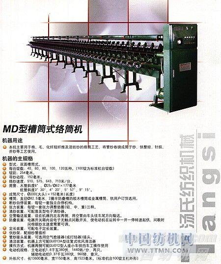 MD型槽筒式絡筒機 -- 興化市湯氏紡機制造有限公司 本機主要用于棉、毛、化纖短纖維及混紡紗的絡筒工藝,將管紗卷繞成筒子紗,供整經,針織、并紗等工藝使用。
