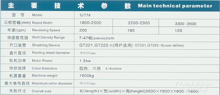 用 途 SJ758 型系列劍桿織機主要適用于織造天然纖維(棉,毛、麻),人造纖維,裝飾紗,雪尼爾紗等,交織成輕薄,中厚,厚重織物。 特 點 本機能滿足于紡織市場織造要求,性能價格比最佳。 該機采用可變程序控制器(PLC)控制,配有自動尋緯裝置,斷緯自停裝置,多色選緯,半自動供油,具有性能穩定,噪聲小,操作維修方便,外形美觀,適應范圍廣等特點。