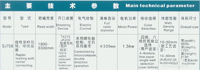 SJ758型提花劍桿織機,SJ758型加寬提花劍桿織機主要適用于天然纖維(棉、毛、麻)、人造纖維、合成纖維、裝飾紗、雪尼紗等,交織成輕薄、中厚、厚重提花織物。