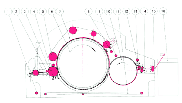 1.車肚花吸點 2.給棉羅拉 3.刺輥 4.刺輥分梳板 5.刺輥吸點 6.錫林 7.蓋板 8.蓋板花吸點 9.道夫三角區吸點 10.道夫 11.輸送簾子 12.剝棉羅拉 13.清潔輥吸點 14.皮圈導棉器15.前壓輥 16.圈條器