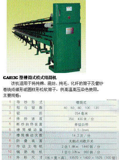該機用于將管紗卷繞成寶塔形筒子紗供整經、并紗或針織等工藝使用。