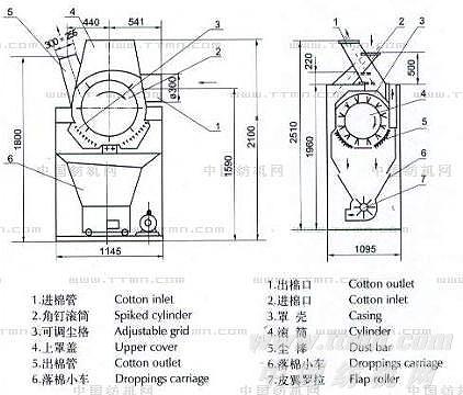 本機作為清花車間的預清棉機,安裝于抓棉機和多倉混棉機之間。原棉在自由狀態下,經角釘滾筒多次均勻地彈打,能有效的去除原棉中所含的大部分雜質