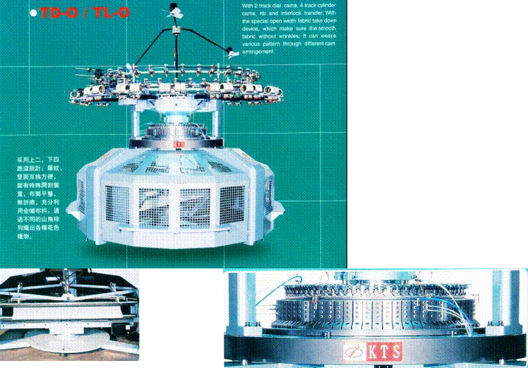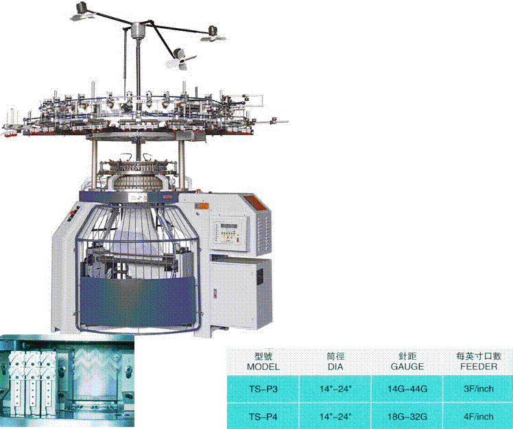 采用四跑道山角設計;布面細膩;外形筒潔。適用原料廣泛,可編織各種風格的單面組織如:平紋布、PK、珠地綱眼、氯綸彈力織物等。特別是運動型T恤產品,更適合于在小筒徑單面機上生產。