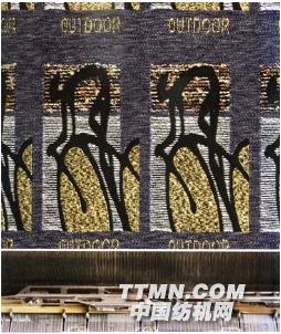瑞士約科布·繆勒 展示一臺MBJ5PR 115劍桿商標機,速度600r/min 。主要特點是應用積極式引緯方式,使同一劍頭適應12色不同粗細緯紗支數引緯。緯紗:滌絲 78dtex、黑絨線10Nm,黃、蘭、黑、綠不同顏色的滌絲78dtex,銀色盧勒克斯55Nm等12色不同粗細緯紗支數,該機主要特點: 積極式引緯,緯紗在中央積極交接,見圖5—37。 在中央交接附近左右側,分別安裝有兩個傳感器, 通過傳感器分別給左右劍頭中電磁鐵信號,使劍頭加 紗器積極打開,完成積極式中央緯紗交接。