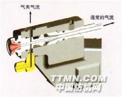 f.主噴嘴加裝緯紗夾(AGS),不引緯時用較小壓力的氣流在緯紗的垂直方向夾持住緯紗,防止彈力紗脫離主噴嘴(見圖 5—23);