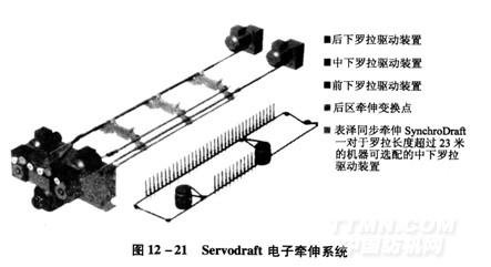 Servodraft電子牽伸系統是Zinnser公司最新設計的使換批時間降到最短,從而使機器有最高靈活性,紗線支數,捻度改變迅速、簡單。牽伸倍數,捻度能按程序的方式進行。在紗線生產中實現不同長度和捻度的竹節花型(見圖12-21)。2011-10-11_150340.jpg