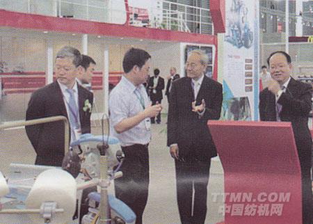 ●中國紡織工業聯合會名譽會長杜鈺洲(右二)和中國紡織工業聯合會副會長高勇 (右一)、夏令敏(左一)等領導在泰坦展位參觀。