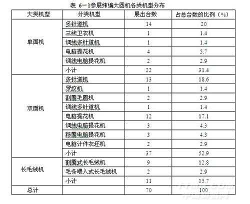 從分類機型來看,展出數量占總數 10%以上的依次為:單面多針道機 20%雙面多針道機 18.6%,電腦提花雙面機 17.1%和割圈長毛絨機 12.8%。這 4類機型占了展出總臺數的約 2/3(68.5%)。