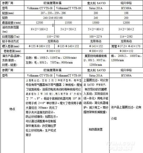 短纖維倍捻機參展商有 10 家,分別是有歐瑞康賜來福、意大利 SAVIO、紹興華裕、浙江泰坦、浙江凱成、經緯股份清梳事業部、恒天渭南、蘇州英邁特、浙江萬利和浙江東星。展出設備 10 臺。(1) 參展短纖維倍捻機主要技術及特征參展短纖維倍捻機的主要技術參數和性能特征見下表