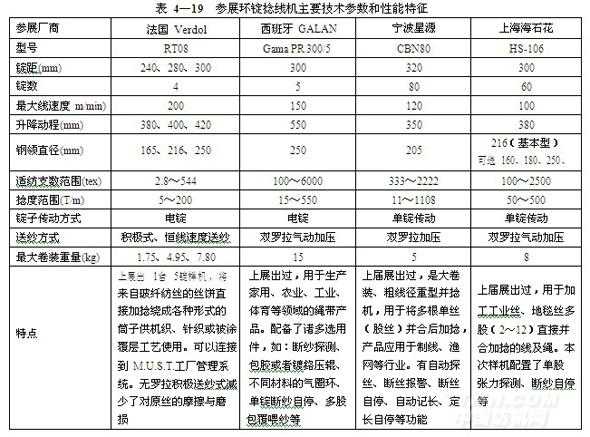 參展環錠捻線機主要技術參數和性能特征見表4-19。