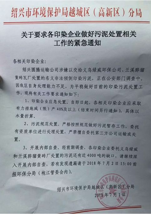3、開展內部自查。經(jīng)前期調查,各印染企業(yè)委托義烏綠威和蘭溪驊騮黃磚廠處置的污泥還有近4000噸的缺口,請繼續(xù)深入開展內部自查,若有發(fā)現(xiàn)遺漏請于2018年7月2日15:00前報環(huán)保分局(袍江管委會內)。