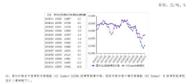 (三)國內外價差擴大。11月CotlookA指數(相當于國內3128B級棉花)折合人民幣每噸11672元,比中國棉花價格指數(CCIndex)3128B級每噸低1387元,價差比上月擴大185元。進口棉價格指數(FCIndex)M級(相當于國內3128B級棉花)月均價每磅75.61美分,1%關稅下折到岸稅后價每噸13182元,比國內價格高123元;滑準稅下折到岸稅后價每噸14442元,比國內價格高1383元。