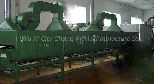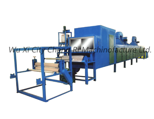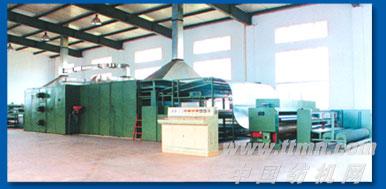 用途特點:用于生產噴膠棉、仿絲棉、無膠棉、濾材等上膠、烘干、定型之用。前后正反噴膠、六層風道上吹下吸,熱風穿透對流。噴膠漿斗雙層水洗簾棒。熱源:蒸汽、導熱油、直燃輕油、熱風。送風形式:噴膠棉中間兩邊各三只風機循環送風。仿絲棉、無膠棉中間兩邊各四只風機循環送風,生產無膠棉、仿絲棉時,只用下面四只風機送風,節能、高效。主要規格:箱體長度:9000mm,10000mm,12000mm機幅:2900mm,3800mm箱體溫度:≤230℃