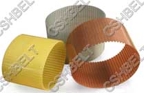 同步齒形帶按材料分為:橡膠同步帶和聚氨酯同步帶二種。橡膠同步帶主要以氯丁膠為原材料,聚酯線繩為抗拉體,該產品具有耐磨、耐老化、抗拉強度大等特點。聚氨脂同步帶一般以尼龍線(或鋼絲、銅絲)作為抗拉體,聚酯澆注而成,具有耐磨、耐油、耐沖擊、美觀等特點。