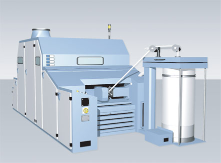 FA228型高產梳棉機把清梳用梳棉機的 原理及結構優點應用于成卷梳棉機中。在刺輥下部增加除塵刀、預分梳板、落棉網調節板;錫林周圍增加固定蓋板、棉網清潔器、多負壓連續吸口;活動蓋板與錫林反轉有效提高分梳能力,提高生產產量及質量。本機能夠長期在130m/min的出條速度下穩定運行,實際單產可達40kg/h以上。改機實際產量受生條定量、出條速度、原料品質、環境狀態、成紗質量、維護管理等各種因素的影響,建議您根據自身的條件確定科學合理的產量和配臺數量。它的給棉板裝在給棉羅拉的上方,實現了順向喂棉,給棉板工作面長度可根據工藝需要調節;刺輥下方設有三個落雜區,每個落雜區均設有除塵刀和分梳板,其中第二、三落雜區還設有調節板,可根據工藝需要調節后車肚落棉量。 主要特點 紡棉卷專用; 機架、錫林筒體,道夫筒體鋼板焊接結構; 給棉道夫單獨電機變頻傳動; 刺輥底部設除塵刀、預分梳板、吸口、落棉量調節板; 錫林底部設罩板、吸口; 傾斜式三羅拉剝棉; 氣動操縱翻轉式集棉器; 蓋板與錫林反向回轉; 多吸點集中連續吸落棉; 可供選擇的自調勻裝置。 可選擇的長短片段自調勻整 長短片段混合環自調勻整,極大地提高生條均勻度。 在棉條出口處的喇叭口裝有一位移動傳感器,棉條的粗細變化由位移傳感器轉化成電信號傳送給控制機構,控制機構經過運算,把結果輸出到給棉變頻器控制給棉羅拉轉速,實現均勻喂棉,達到均勻喂棉,保證長片段的均勻一致。 有位移傳感器檢測棉層的厚薄變化,并把檢測到的位移量轉換成電信號傳送給控制機構,控制結構經過運算,把結果輸出到給棉變頻器控制給棉羅拉轉速,實現均勻喂棉,保證短片段的均勻-短片段能較好地控制短片段棉條的重量波動,控制生條內不勻。在給棉羅拉座上裝置。 長短片段有機地融合,有效地控制棉條重量不勻,使設備達到最佳狀態。