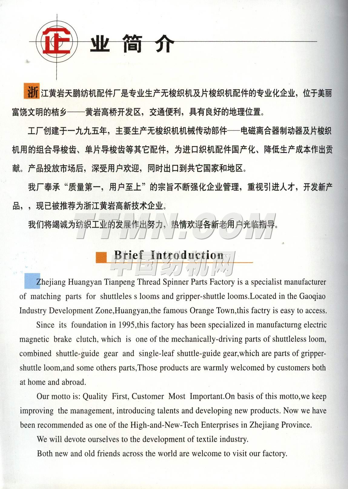 您所在的位置:紡機網 > 紡織機械樣本庫 > 浙江黃巖天鵬紡機配件廠