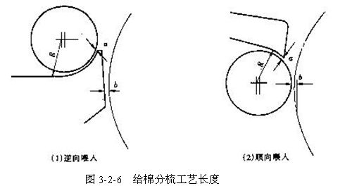 (4)給棉分梳工藝長度  給棉分梳工藝長度指給棉羅拉與給棉板握持點a到給棉羅拉(或給棉板)與刺輥最小隔距點b間的距離,如圖3-2-6所示。