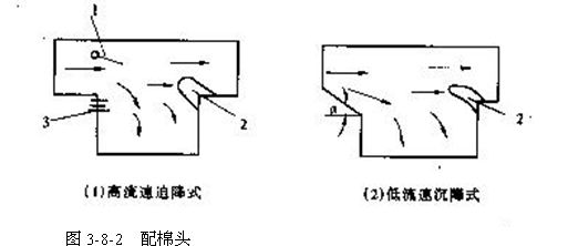 ⒈配棉頭 輸棉管與梳棉機后部喂棉箱連接處起分配原棉作用的部分稱配棉頭,配棉頭有高流速迫降式和低流速沉降式兩種,如圖3-8-2所示,圖中(1)為高流速迫降式配棉頭,內有擋棉板2(俗稱羊角)、調節板1和插入板3,三者相配合,迫使輸棉管內水平運行的棉塊向下落入喂棉箱內,擋棉板的高度,調節板的角度和插入板的深度經適當調整,可控制落入棉箱中的棉量。