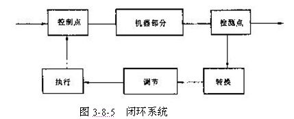 (二)梳棉機的自調勻整裝置  根據檢測與控制位置不同,可將自調勻整裝置分為閉環、開環和混合環三種類型。當檢測點在機器輸出方某處,控制點在喂入處,將檢測點到控制點的勻整過程和產品的運動過程連接起來,成為一個封閉的環狀,稱為閉環型自調勻整系統,如圖3-8-5所示。在梳棉機上采用閉環型自調勻整系統,一般是在輸出生條的大、小壓輥附近檢測,控制給棉羅拉變速。開環與閉環相反,檢測點在機器輸入處的某部位,而控制點則在輸出處,勻整過程和產品運動過程不成為一個封閉環狀。在梳棉機上開環一般有兩種,一種是在喂入給棉羅拉之前或給棉羅拉處檢測,控制給棉羅拉變速;一種是梳棉機有預牽伸機構,在后羅拉處檢測棉條,控制前羅拉和圈條器變速。混合環系統是開環與閉環兩個系統的結合。
