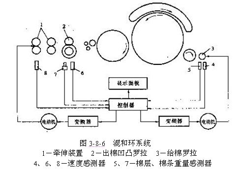 ⒊混合環型   如圖3-8-6所示。混合環型式的構成,可以在兩處檢測一處執行,也可以在一處檢測兩處執行。如梳棉機輸出方設計有預牽伸裝置,可在后羅拉一處檢測,分別控制前牽伸羅拉和后給棉羅拉變速,從而組成混合環型式的自調勻整裝置;旌檄h將開環和閉環的優點結合在一起,能修正由于各種因素變化造成的波動,提高勻整效果。它不僅能勻整中、短片段不勻,而且也能勻整長片段不勻,這對于縮短工藝流程、省去粗紗工序、減少并條工序是有利的,可應用于為轉杯紡或其它棉條直接紡紗的生條生產。