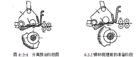 3、分離接合階段    如圖4-3-4所示,分離接合階段從纖維開始分離到分離結束為止。這一階段各主要機件的工作和運動況為:上、下鉗板開口增大,并繼續向前運動將須叢送入分離鉗口;頂梳向后擺動,插入須叢梳理,將棉結、雜質及短纖維阻留在頂梳后面的須叢中,在下一個工作循環中被錫林帶走;分離羅拉繼續順轉,將鉗板送來的纖維牽引出來,疊合在原來的棉網尾端上,實現分離接合;給棉羅拉繼續給棉。