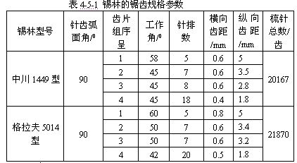 2、錫林定位與分離羅拉運動配合關(guān)系   錫林定位的早晚,影響錫林末排梳針通過錫林與分離羅拉最緊隔距點時的分度數(shù)。錫林定位晚時,錫林排針通過最緊隔距點時的分度數(shù)亦晚,有可能將分離羅拉倒入機內(nèi)的棉網(wǎng)抓走形成落棉。當所纖維越長時,錫林排針通過最緊隔距點時分離羅拉倒入機內(nèi)的棉網(wǎng)長度越長,越易被錫林末排針抓走;因此當所紡纖維越長時,要求錫林定位提早為好。錫林定位不同時,錫林末排針通過最緊隔距點的分度見表4-5-2。
