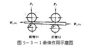 (二)機械牽伸與實際牽伸    須條被抽長拉細的倍數稱為牽伸倍數。用牽伸倍數可以表示牽伸的程度。如圖5-3-1所示為牽伸作用示意圖。