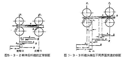 由上式可知,由于前面纖維變速較早,后面纖維變速較晚,使牽伸后纖維頭端距離較正常移距偏大。