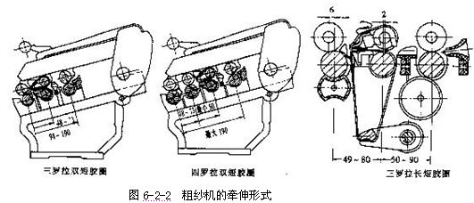 (一)粗紗機的牽伸型式  須條從喇叭口出來,即進入牽伸裝置。目前粗紗機普遍使用雙皮圈牽伸裝置,其類型有四羅拉雙短皮圈(2)、三羅拉雙短皮圈(1)、四(三)羅拉長短皮圈(3)三種形式。如圖6-2-2所示。